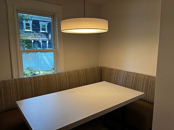 Step into a piece of history with these beautifully renovated apartments in a Victorian style home. The 1 bedroom unit offers a unique blend of original charm and contemporary design with kitchen bench seating and table, tall ceilings, original materials, and professionally designed renovations with high-quality appliances. It includes generous room sizes, modern kitchen finishes, one garage space, one off-street parking space, and access to a dry basement for tenant storage. Cold water, internet, and snow removal are included. Common areas include a side porch and yard, with each unit having a dedicated portion of the charming front porch. Conveniently located just a 7-minute walk from the commuter rail station to North Station and minutes from I-95 and I-93, the property is also a short walk from the town green and Lake Quannapowitt. A resident property manager ensures prompt assistance, and the community is quiet with neighborly tenants sought. Landlord references and background checks are requested, and financial information is required. Smoking is not allowed, but cats are considered. 1 year Signed Lease Agreement for 1 Bedroom Apartment Appliances: in unit washer/dryer Parking: Includes one off-street parking space and one garage space Additional: Additional storage Includes: cold water, internet and snow removal Property Manager: Resident on premises for prompt assistance Landlord References: Optional but preferred Background Check: requested Financials: requested NO Smoking please Cats: considered