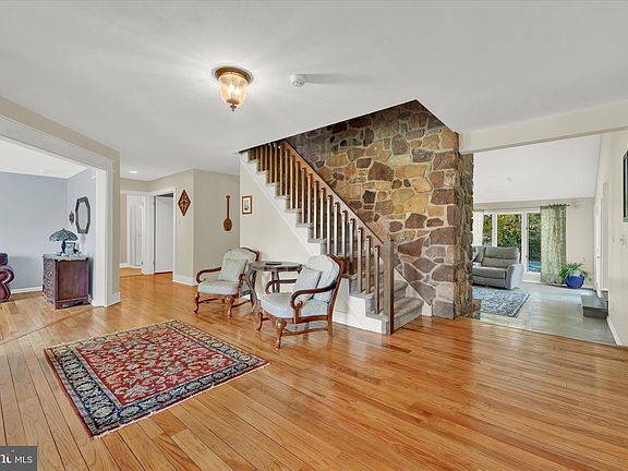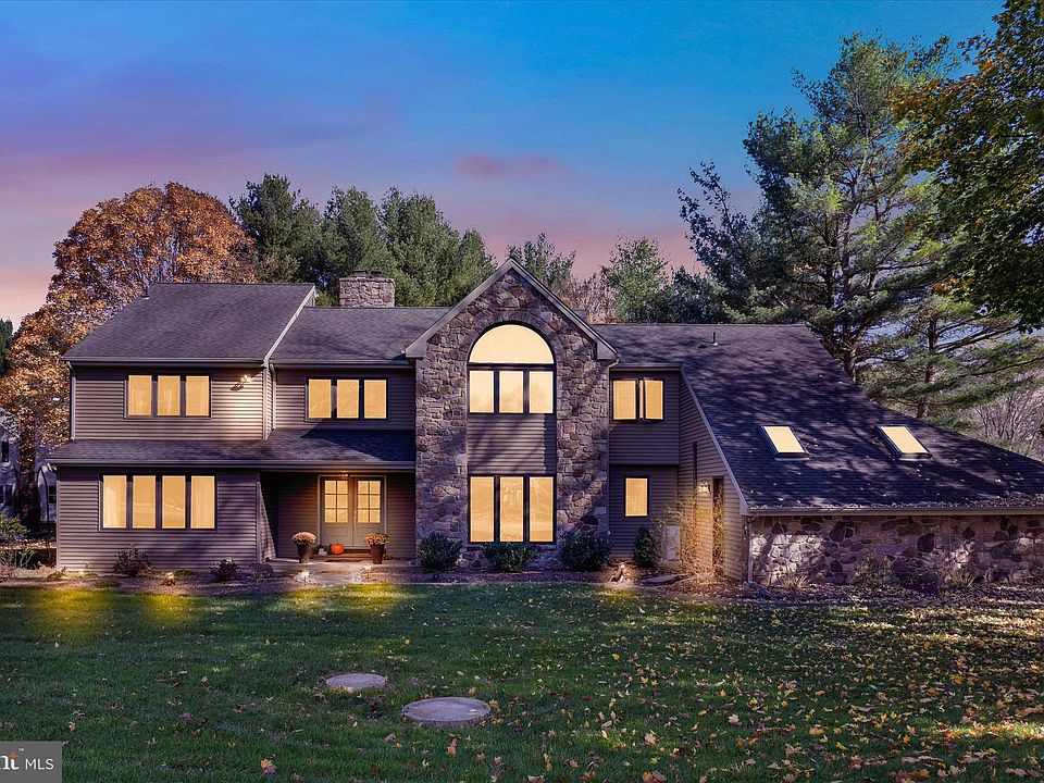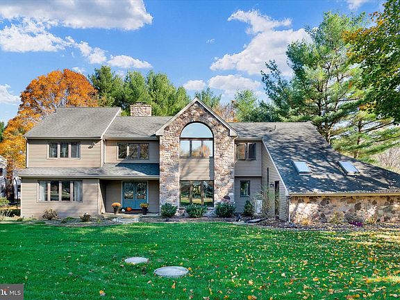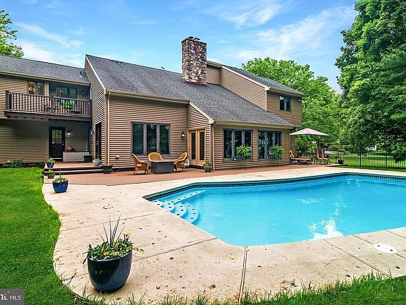 River Knoll, in Washington Crossing, is an enclave of 75 beautifully maintained homes on large wooded lots.  This magnificent home sits on a nearly 1-acre corner lot and, at 4000 square feet, is one of the largest in the neighborhood. Upon entering the new double front doors, you will be amazed by the size of the entry foyer and the stone wall that flanks the staircase. The oversized decorative molding is very impressive and was a signature feature of the home's renowned builder David Knipe. The gorgeous hardwood floors extend from the foyer through the dining room, living room and first floor bedroom. Windows comprise the entire back of the home, offering stunning views of the inground pool. The floor-to-ceiling windows give this home abundant light, bringing nature inside. Entering the kitchen, renovated in 2022, you will be amazed by the amount of cabinets, boundless quartz countertops and the very large eating area that looks out onto the pool.  An oversized island featuring a 6-burner KitchenAid gas cooktop is a chef's dream.  The undermounted farmhouse sink, tasteful hardware, recessed lighting and KitchenAid double ovens complete the picture. Stepping down into the big, bright and beautiful family room with new tile floor, the gorgeous floor to ceiling stone fireplace with propane insert will delight. The fireplace has Bucks County written all over it and brings warmth and charm into a room with a towering two-story cathedral ceiling. Also on the main level is a large bedroom with double closets and views over the yard and pool.  An adjacent full bath makes this room perfect for a guest, in-laws, nannies and anyone else wanting some privacy in their own special retreat.  As if this weren't enough, this home features an office with its own private entry, heating and a/c system and access to another full bath. The possibilities of the space are endless.  A first floor laundry room is a great summation to the main floor. Walking upstairs, in addition to the primary suite, there are three large bedrooms and a full bath. The primary bedroom has a cathedral ceiling with skylights, a magnificent sunburst window and its own sitting area making this a very spacious retreat after a long day. The primary bathroom is new and beautiful showcasing a deep soaking tub, oversized walk-in shower, dual vanities and radiant heated floors.  An enormous walk-in closet is accessed from the bathroom. Sliding glass doors open from the primary bedroom to your own private balcony/deck.....there's no better place to have your morning coffee. The backyard is fully fenced and features a magnificent heated concrete saltwater pool (8' depth) which is a delight for many months of the year in PA. When you're not poolside, you can be sitting on either side of the wraparound deck which is the perfect spot for the BBQ grill. The grounds around the pool are lush with mature trees adding a welcoming bit of privacy.  There is an oversized two car garage with direct access into the home and a partially finished basement offering an abundance of storage space.   This home is move in ready and waiting for its next owner.  You can't beat the location with easy access to Philadelphia, New York and the Princeton corridor.  This is an area that has abundant history, phenomenal schools, great restaurants and wonderful shopping.  In my 35 years of selling real estate in Upper Makefield, this home stands out as one of the finest.  It might be time to make it yours.