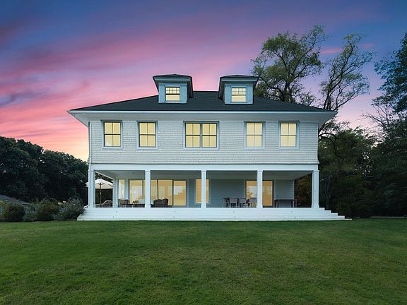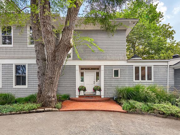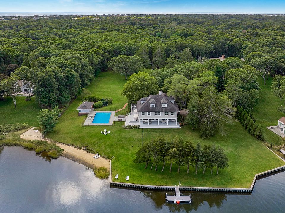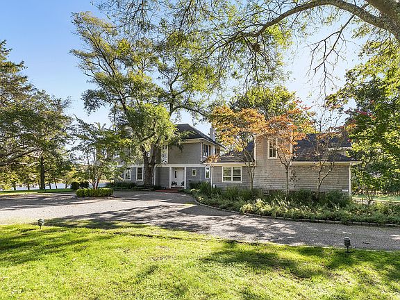 Down a 600' tree-lined double-entry drive that spans across almost 5 private wooded acres, there appears a grand, 3-story waterfront estate surrounded by expansive lawns and mature shade trees--a cherished generational summer home, and a future respite for generations to come. With 8bd, 7ba, and a trove of charming bonus spaces, the possible configurations and potential of this home are infinite. The main level features a semi-open floor plan and vast entertaining spaces, each with exquisite water views and access to the wrap-around sun decks and dining porches. Each room is distinct, with fireplaces, built-ins, and lovely architectural details including a rotunda, coffering, beams, curved staircase and more. The staff quarters are tucked neatly behind the kitchen, with a butler's pantry, laundry/mud room, and access to the attached 2-car garage. The second level features five suites including a spacious master with sitting room, soaking tub, WIC and water views. The third level features a private two-bedroom suite with oversized bath, and two WICs, while a bonus private suite sits above the attached garage, perfect for guests or staff. The unfinished lower level is 1480 sqft of sheer potential, and a lovely 650 sqft detached-garage--currently a gym--could also become a guest house or art studio. Yet the outdoor spaces are even more breathtaking, with almost 300' of bulkhead including a floating dock, 100 more feet of sandy private beach perfect for lounging, kayaks and paddleboards, a pool with bluestone surround and charming pool house with private garden, plus endless entertaining decks, al fresco dining areas, and wide, green lawns. Just moments to the picturesque village of Quogue, ocean beaches, and the exquisite fine dining, shopping, and entertainment of Westhampton Beach, 11 Bay Road is the summer estate to build dreams upon.