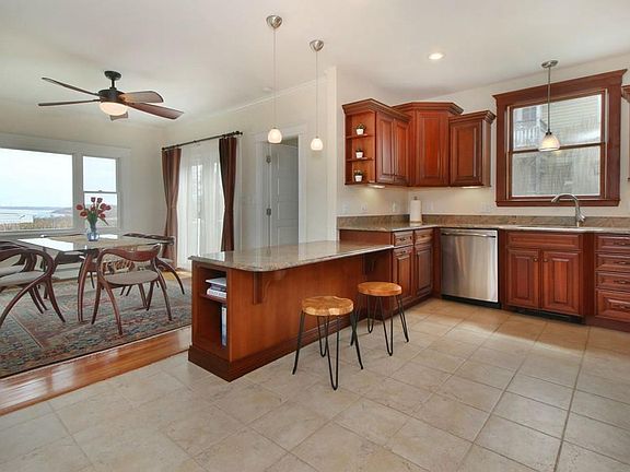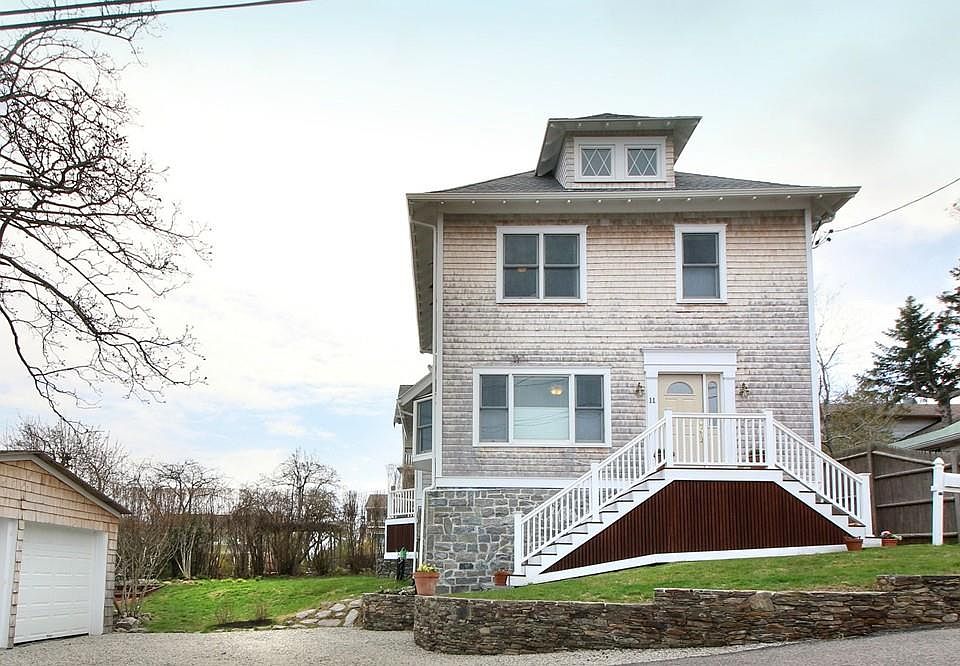 Spectacular water views of outer islands and Boston skyline from this lovely home in Squantum. You will feel you have moved to the Vineyard! Well appointed and warmly decorated home boasts a nice spacious kitchen w/ granite, S/S appliances, pretty wood cabinetry and leads to an expansive mahogany deck/back yard for summertime dining and grilling entertainment. Hardwood flooring throughout. The living room is perfect for that evening snuggle by a gas-lit fire. Upstairs features a brand new bathroom and 3 equally sized bedrooms. Unfinished walk-up attic has great expansion potential for another 500sf and already has a new deck with glass slider offering sweeping views. New Mini Split AC system for downstairs. Situated on a private double lot with 2 car garage, garden beds and new stone retaining wall w/ bluestone steps. Discover Squantum, the peninsula community just 7 miles south the City w Public transportation access. No Flood Insurance required
