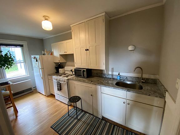 This is a one bedroom apartment in a restored school building, located in Concord's quaint West End. Walk to White Park, close to Main Street, and easy access to highways. This unit is located on the second floor, has a deck, hardwood floors, two closets, updated kitchen with granite countertops, neutral paint colors, new windows, and on site parking. There is on site coin operated laundry. Tenant pays all utilities (gas heat and electric). Small dog and cats considered for monthly fee. No smoking. Application required prior to showing. Tenant pays all utilities. On site coin operated laundry. 1 year lease - or shorter term through spring if desired. Cats okay, small dog considered - monthly fees apply.