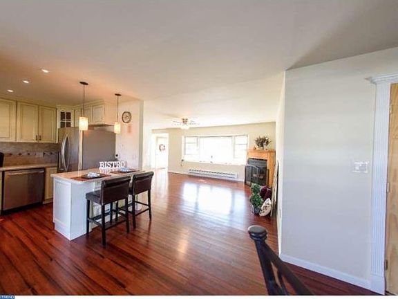 Welcome home !! This beautifully expanded home boasts an updated open floor plan with over 1680 square feet of living space, including 4 bedrooms, 2 1/2 bathrooms, kitchen with breakfast bar, formal dining room and foyer. As you enter the home the polished cherry stained bamboo hardwood floors, natural light and open space is impressive. The modern kitchen features solid antique white cabinetry, sparkling solid surface countertops, no-slam drawers and doors, lazy Susan, corner sink with window and newer stainless steel appliances. The kitchen flows into a freshly painted dining room and living room with a bay window, cozy propane fireplace and stunning cherry stained bamboo hardwood floors throughout. The Pella slider leads out to a patio and large backyard with a large shed, creating a perfect space for entertaining guests. For more entertaining there is a family room with another Pella slider and more hardwood flooring. A laundry room with half bathroom completes the first floor of this home. On the second for is the master bedroom with a private full bathroom with a beautiful stall shower, vanity and solar powered, remote controlled skylight. Newer windows overlook the backyard. Down the hallway is another full bathroom with a bubbler bathtub and another solar powered remote controlled skylight. Three spacious bedrooms are farther down the hallway. All of the bedrooms have brand new wall to wall carpet; are freshly painted and 2 have built in bookshelves. In addition to the lovely interior, this home also offers excellent curb appeal, a front patio, nice landscaping plus off street parking and a garage. It has a newer roof, attractive vinyl siding, efficient individual room controlled electric heat, and very inexpensive propane cooking. This home is move in ready and has easy access to I95, Philadelphia and Princeton. Come make this house your home. It is located in Bristol Twp, one of the best places to live in 2016 according to Money Magazine. Please check it out.
