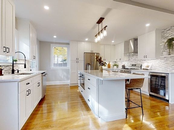 Completely renovated Garrison Colonial in one of Belmont's premier neighborhood's, the Benton Estates. Seasonal views of the Boston skyline on every floor, this expansive & redesigned property features a stunning chef's kitchen equipped with custom cabinetry, quartz counters, & large eat in island w/ built in convection oven. You'll love entertaining in the massive living room overflowing w/ natural light & gas fireplace. 2nd floor offers 4 generous bedrooms, including the spacious primary w/ walk in closet, beautiful bath w/ double vanity & gas fireplace! Private 3rd floor features en-suite 5th bedroom, gorgeous full bath & bonus room perfectly utilized as an office. State of the art efficient 3 zone heating/cooling, tankless hw & all smart lighting/thermostats! 1st floor laundry, finished room in lower level & detached garage. Conveniently situated just steps to Cushing Sq, public transportation & Cambridge/Boston line, this location is the perfect blend of privacy & accessibility.
