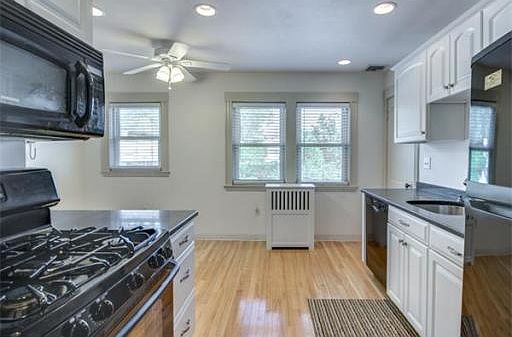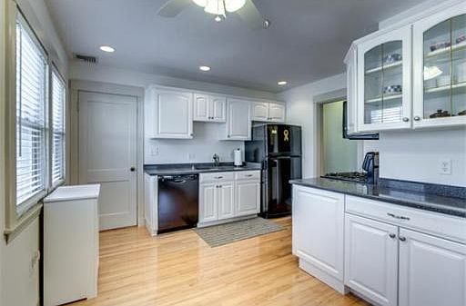 One block from the heart of Brookline Village, come see this beautiful condo on a super quiet and private street. This upstairs unit of a converted 2-family house has a bright eat-in-kitchen with quartz countertops and beautiful glass display cabinets, a formal dining room with original built-ins, and living room with a brick fireplace and great natural light from the sliders to a private covered balcony. 2 bedrooms, 1 bathroom, central a/c, private laundry, extra storage in the basement, common backyard, and 3 parking spaces (incl. 1 garage space). Dining room could easily be used as a 3rd bedroom if you wanted. Kitchen and bathroom have both recently been renovated. Overnight parking is allowed on this street!