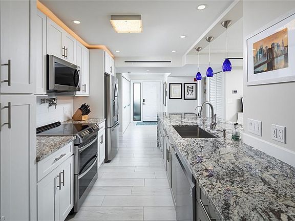 TOTALLY REMODELED CONDO – INCLUDES A LARGE 1 CAR GARAGE - GORGEOUS VIEWS OF THE GULF from the 10th Floor - A stunning and delightfully relaxing corner retreat tucked away within the sought after community of Vanderbilt Surf Colony 1 on Vanderbilt Beach. This condo has been fabulously redesigned boasting many custom and relaxation enhanced features and is a rare find in today’s market. The beautiful master and guest bathrooms have been completely redesigned for privacy and function. They have new vanities, granite counters, high profile toilets and lavish porcelain tiled showers. The new CONTEMPORARY kitchen has custom cabinetry with soft close drawers with stainless steel pull handles,pendant bar and ceiling lighting, high end LG stainless steel appliances, reverse osmosis system, and a massive island with a granite countertop along with a French door wine/beverage fridge and an open concept to the rest of the home. The living and dining spaces have LED multicolor lighting systems to enhance your dining and living experiences. The condo boasts too many upgrades to list but here are some of the other incredible features: new impact casement windows with motor operated sun shades, New insulated glass sliding doors; all manufactured by PGT, motor operated aluminum hurricane shutters, murphy wall bed system surrounded by a custom built in closet space, crown molding, wide plank porcelain tile throughout, contemporary ceiling fans with lights, recessed LED lighting on dimmers and much more. The electrical panel and breakers have been replaced with new Square D equipment and the electrical distribution has been updated and expanded. The wraparound corner lanai offers the best of both worlds with the peaceful quiet early morning sunrises in the east to stunning picturesque evening sunsets to the west. The primary bedroom has a walk out balcony where you may enjoy your morning coffee and view the stunning sunset sky at night. The condo also has a large storage closet on both the 10th floor and the main ground floor for all beach and entertainment needs. Surf Colony is an active lifestyle community and offers a plethora of amenities including – a newly renovated and modern Lobby and resident public space featuring: an indoor fitness Room, new modern kitchen and meeting/party room with a library, ping pong and TV’s. Residents will enjoy the large heated pool, pickleball, tennis, and bocce. The marina features a boat dock with boat slips and kayak slips available for lease subject to availability. Walk to the pristine Vanderbilt Beach which is steps away in just minutes and enjoy world class dining, shops and entertainment, all nearby.