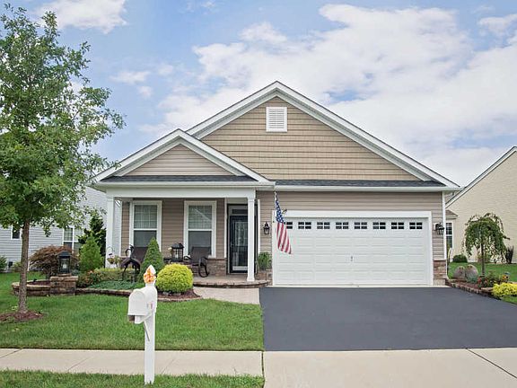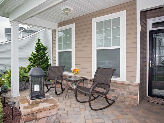 Be prepared to fall in Love with this extended San Marcos/Monterey model. Home features: 2 bedrooms PLUS a spacious and bright den/office, beautiful neutral colors with engineered hardwood flooring throughout. Kitchen has upgraded granite counter tops, a center island with deep sink, touch faucet and 42'' cabinets. Just off kitchen is an expanded laundry rm with wall shelving for off floor storage with direct access to garage. Expanded Master bdrm has walk/in closet w/ organizers for maximized space. Double garage has vinyl tile flooring w/ walk up staircase to bonus 10x20 carpeted room. Also has add'l storage under staircase. Front & rear paver stone patios with beautiful landscaping. Heating/AC units are located on main fl. for convenience. This home shows like a model - Come See