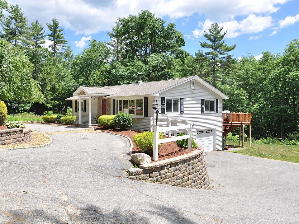 Beautifully UPDATED So. Londonderry ranch with 2-car garage under and walk-out finished basement. OPEN CONCEPT living area and HARDWOOD FLOORS throughout 1st floor! 3 bdrms, 3 baths. Eat-in kitchen has 6 ft island, comfortable dining area, granite counters, propane cooktop, stainless steel appliances; sliders to large back deck. Private Master Suite with full bath has jetted tub with shower. Many updates: all NEWER WINDOWS, newer PROPANE BOILER and SUPERSTOR hot water tank, WELL PUMP and PRESSURE TANK, newer 200 AMP ELECTRIC and WHOLE HOUSE 8 KW GENERATOR, and more! Lower level has mudroom/office and a den which walks out to covered patio which overlooks Beaver Brook valley: 300 ft waterfront provides seasonal ambiance, for seasonal fishing and kayaking, often drie out later in the year. Plenty of storage, parking and privacy. Circular drive up front and wrap-around driveway to lower level garages. Town Forest is across street. Easy commute. Seller prefers November closing.