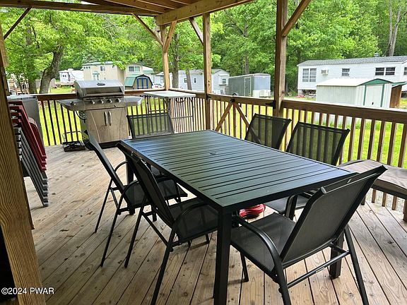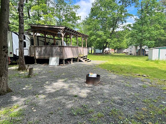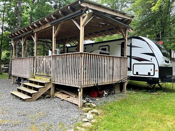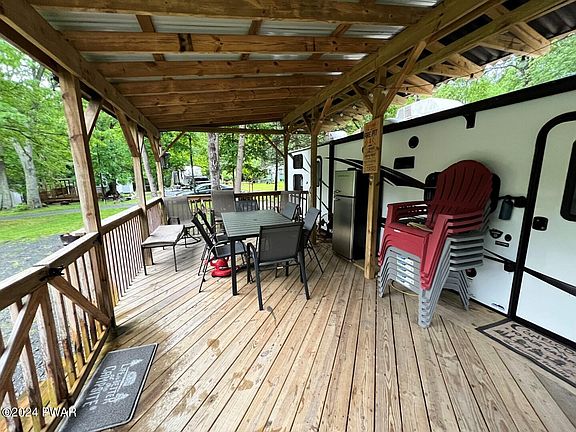 THE PERFECT FIND! ~ This well maintained camper on OWNED LAND offers everything you could possibly need. Open floor plan maximizes the living space and include full kitchen, full bath with tub/shower, private Primary Bedroom and 2nd bedroom/bunkroom which can sleep additional 5. The living area offers additional sleeping. The spacious full covered front deck is perfect to entertain, or just relax and unwind. This is a Gated/Private Campground which offers outdoor pool, trash basketball, horseshoes, and playground. Taxes are less than 30/yr. Located only a few miles to public boat launch on Lake Wallenpaupack too!