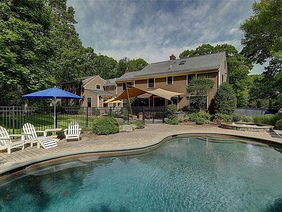 Beautiful Contemporary Colonial featuring 5 BR's, 4.5 baths and over 4400 sq ft of living space. This lovely home was completely renovated in 2008 and an addition of a 3rd garage and office/media room was completed in 2010. More recent updates include new central air system, brand new hydro air furnace and hot water tank, hardwoods, high ceilings, in-ceiling speakers, whole house generator, radiant heat in all full bathrooms, large rooms and great floorplan for entertaining. The first floor includes a large living room w/ gas fireplace, beautiful dining room with coffered ceiling, large chef's kitchen including Wolf range, Sub-Zero refrigerator, custom cabinetry, island with breakfast bar and separate dining area. The family room with gas fireplace is just off the kitchen and leads you to a first floor office or fitness room. The second floor includes a large master BR with full bath and unique 3rd floor walk-in closet. 3 additional bedrooms and a full bath finish off the 2nd level. A second staircase over the garage bays leads you to a guest suite with full bath and home office/media room. This home sits on over ½ acre at the end of a cul de sac and is completely fenced in and very private. The spa-like backyard features an inground gunite pool and hot tub with a beautiful bluestone patio with grilling area and gorgeous landscaping. The perfect yard for entertaining. Only steps to Nayatt Elementary School, Barrington Beach and only 1 mile from downtown Barrington.