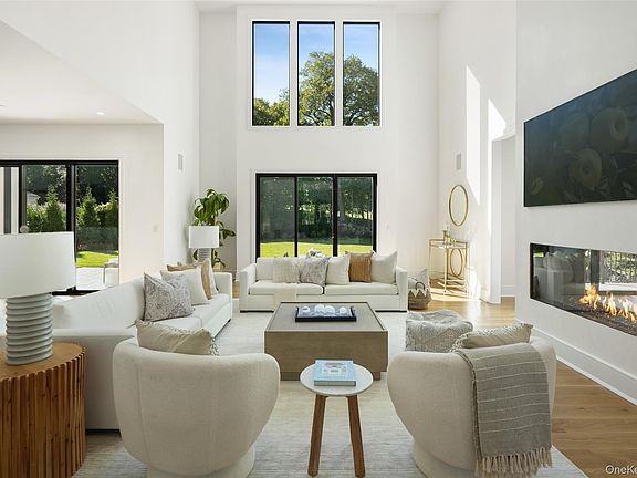 The dramatic entry hall, crowned by a 21-foot ceiling and anchored by a Venetian plaster fireplace, introduces interiors of remarkable light and proportion. Expansive Marvin windows frame the verdant vistas, while wide-plank white oak floors and refined architectural detailing lend a sense of understated sophistication throughout.