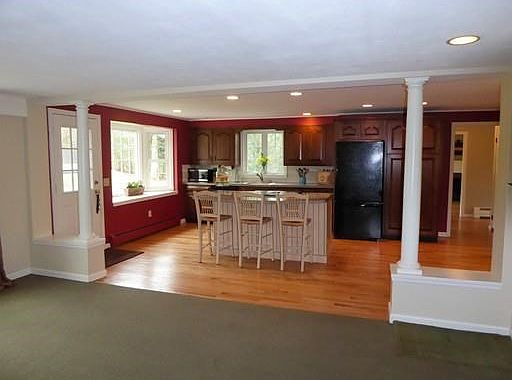 Wonderful, spacious Colonial sitting on 1.6 acres which abuts conservation land. Newer roof and windows approximately 5 years old. Updated kitchen with columns open to family room with fireplace and built-ins. Large kitchen with center island that has Jennaire drop in stove and breakfast bar. Built-in desk area and pantry closet with pull out shelves. Newer appliances, hardwood floor, bay window and recessed lighting makes kitchen very light and bright. Front to back living room with hardwood floor and wood burning fireplace. Many rooms newly painted and all hardwood floors refinished. Second floor offers over sized master bedroom with two double closets and hardwood floor and additional three bedrooms with hardwood. Enjoy summer living in private rear yard that features 16'x32' ingound pool with new cover. Brick patio and newer Kloter farms shed.
