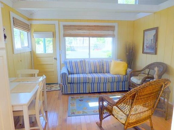 Rare opportunity to own coveted seasonal cottage. Perfect move in, fully furnished & outfitted 2 bed, 1 bath condo.Cottage with very airy feel ,vaulted ceilings in living room & kitchen. Lots of natural light, large windows & 2 skylights. Located right around the corner from all Kennebunk/Kennebunkport nightlife, restaurants, shops & walkable to Gooches Beach. You have large common grassy area to play bocce or toss a ball.Strong rental history. Wkly rate is 900.00. Backyard has distant Kennebunk River views.