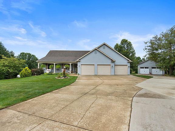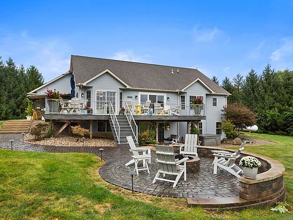 Enjoy country views from the back deck of this ranch home with a walk-out basement that sits on over 3 acres with a shared pond. Inside you will find a bright and airy family room and kitchen with lots of windows and vaulted ceilings. Also on the main floor are 3 bedrooms and 2 full bathrooms. Downstairs is a large rec room, a wine bar, a bonus room, a bedroom, a full bathroom, and a storage room. Exit the walk-out basement through the sliding glass doors and enjoy some time in the hot tub that stays with the house. Head back up to the deck and you will find an outdoor kitchen and a hardscape with a fire pit. Recently built on the property is a 24x40 detached 4-car garage should you need more space.