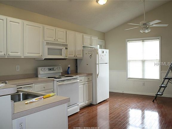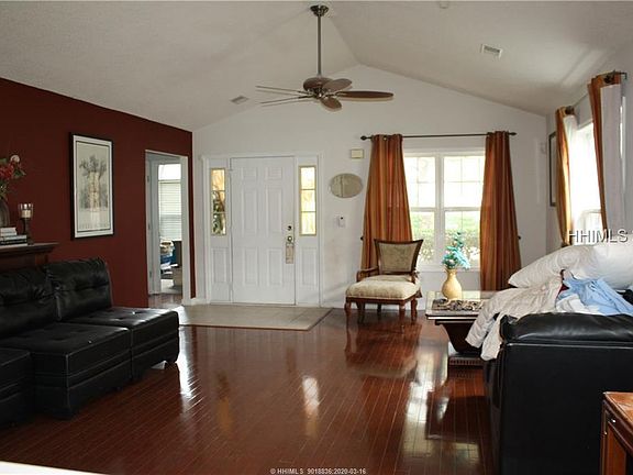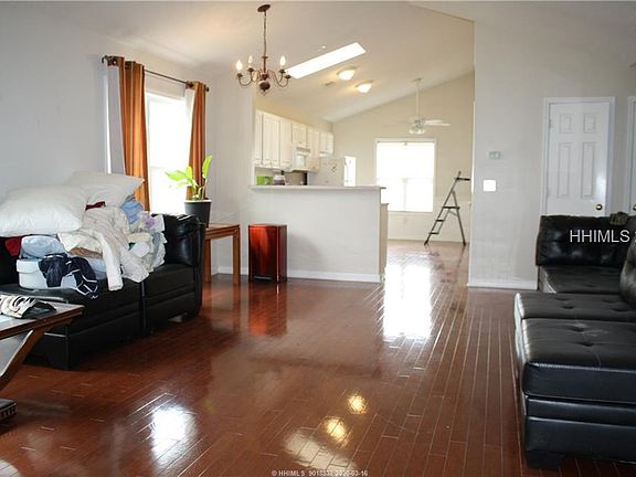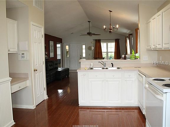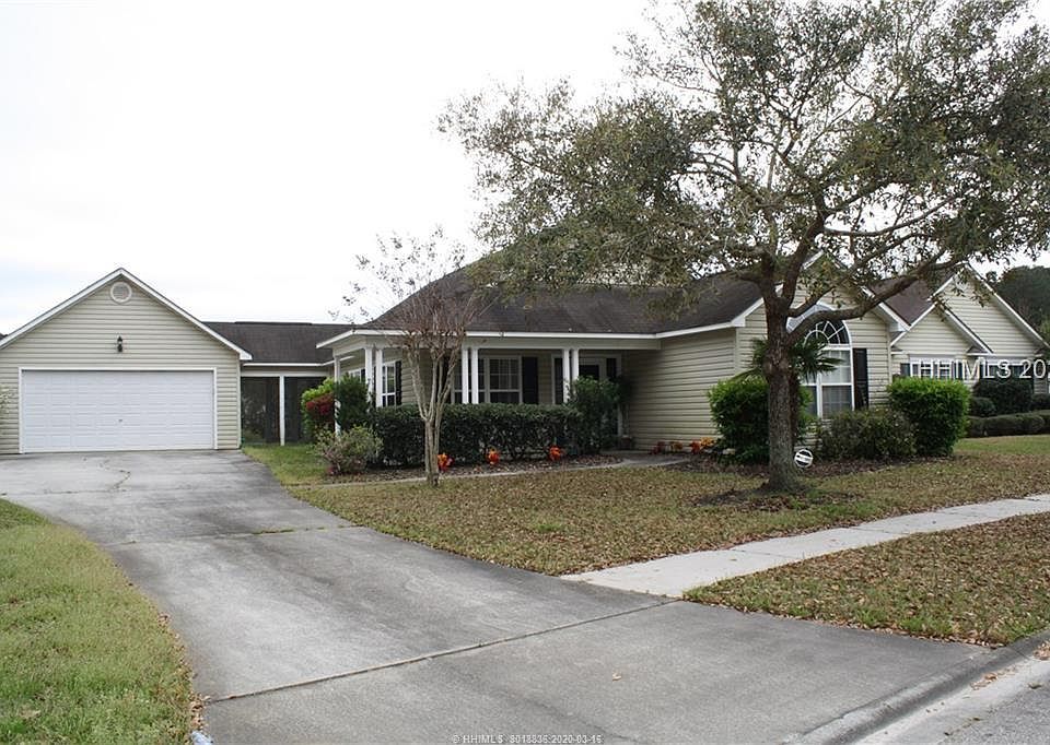 Wonderful 3 bedroom 2 bath home overlooking a lagoon and steps from the park in Woodbridge. This home features a screened breezeway from the 2-car finished and climate controlled garage to the home, wood floors in the main living area and cathedral ceilings. The master bath needs a vanity, mirror and light fixture to complete the renovation and is being sold "as-is". The two guest bedrooms are off to the front of the home. Woodbridge features a community pool, sidewalks, and large park. Close to all that Bluffton has to offer.