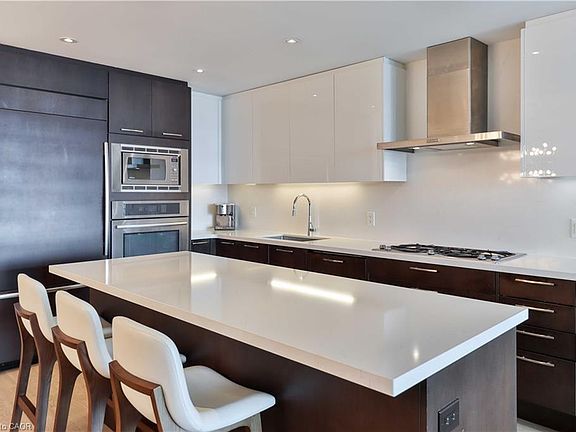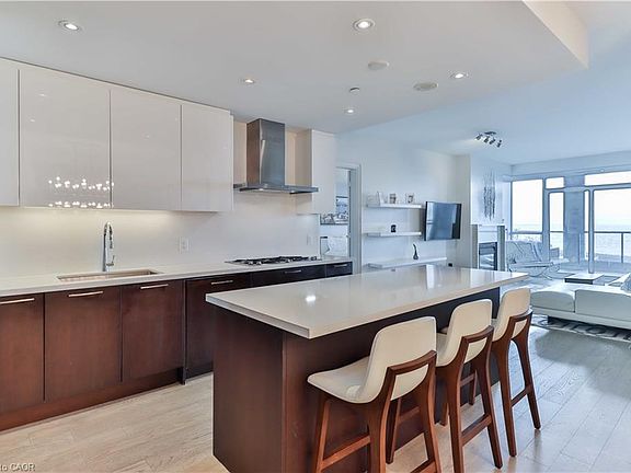 Experience Oakville's lakefront luxury living at its finest in this stunning 2 bedroom + den, 3-bathroom home, completely transformed with over $100K in high-end renovations. Step into an open-concept living space adorned with engineered hardwood floors, elegant lighting fixtures, and a chefs kitchen which boasts quartz countertops, built-in appliances, and a stunning center island, perfect for both entertaining and everyday living. Enjoy the spacious 220sq ft outdoor terrace with panoramic lake views, ideal for relaxing or hosting guests. This home includes 2 parking spots and a storage locker for added convenience. Indulge in resort-inspired amenities such as saunas, rooftop pool and hot tub with cabanas & a BBQ/dining area, along with a state-of-the-art gym and yoga studio offering breathtaking lakeside views. Entertain in style with an upscale wine lounge, 3 party rooms for every occasion, a cinema, and a game room. Unwind in the warm, elegant library, and don't forget to take advantage of the underground car wash and pet washing station. Every detail has been thoughtfully curated for refined, turnkey lakeside living in glorious Bronte Village!