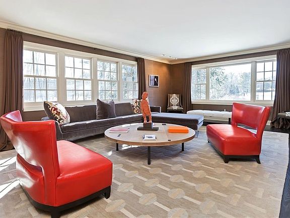 This Country Retreat with Urban Chic Sophistication features Stone Pillar Entrance, Belgian Block Courtyard, Mature Trees, Level Lawns, Picturesque Pond w/ Private Dock, Heated Pool, Fire Pit and Wisteria covered Pergola over e Terrace with Grill and Cooktop. 5 Bedroom/5 Bath Residence has walkout Lower Level with Media/Game Room, Gym, Sauna and Staff Quarters. 1st Floor Den could also be 5th Bedroom with Private Bath, Small Office conveniently located off Kitchen, Living Room and Family Room w/ Fireplace enjoy views of the picturesque pond. Master Suite w/ Fireplace features two Walk In Closets and Master Bath w/luxury Bath and Steam Shower. Landscape lighting and exterior sound system make this a perfect country retreat.