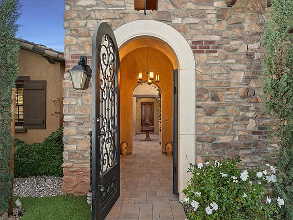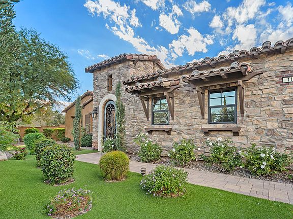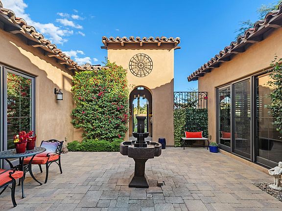 This gorgeous home with an interior location sits within the prestigious gated Escala enclave offers 4,085 sq.ft. of resort-living. Designed by Gold Nugget Award winning Architect, Mark Scheuer and built by GHA, the blend of traditional Tuscan with contemporary design makes this home an inviting blend of timeless charm. The courtyard entrance with centerpiece tiered fountain makes your every wish come true. Once inside the warm rich wood tones and stone accents accentuate the open concept floorplan. Easy entertaining with the expansive kitchen featuring long slab granite counters, travertine backsplash and plenty of cabinets. European beamed ceilings in the great room with a thermostatically controlled fireplace, wet bar and large paned windows overlooking the pool area. Tile floors in the main living space, with wood floors in the media/family room, primary bedroom and office, and carpeting in the guest bedrooms. All bedrooms have en-suites and good separation. The home office could easily be converted to a 4th bedroom. Lovely mountain views from the backyard, complete with several seating areas, an outdoor kitchen and automated patio sun screens. The pebble finish pool and spa are adorned by gas firepots and an expansive patio of custom paver stone tiles. The 3-car epoxy garage has built-in cabinets. Recent upgrades include energy efficient windows across the back of the home, on-demand tankless hot water heater and an artificial turf lawn. Prepare to be amazed!