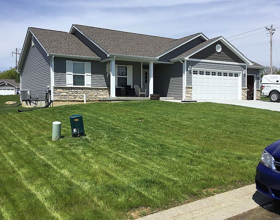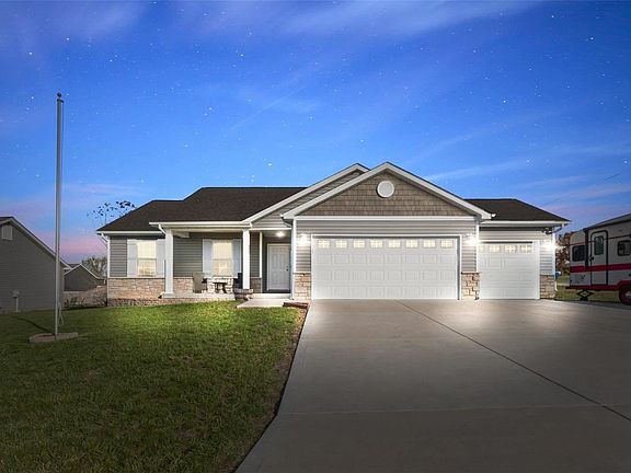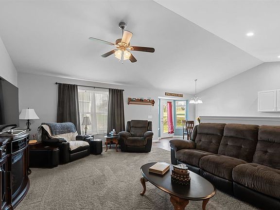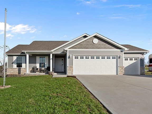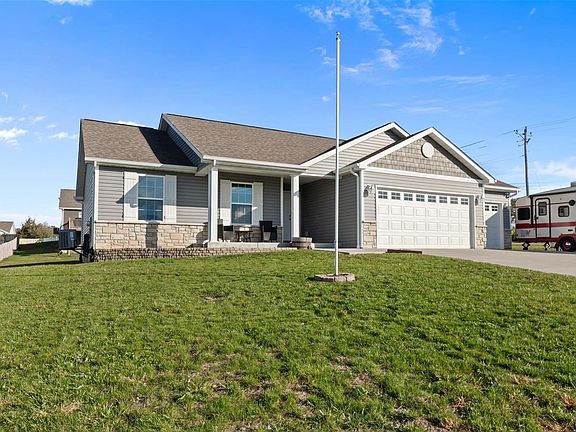 Beautiful 3 bedroom, 2 bath home with a 3 car fully insulated, finished garage. Inside you'll find a vaulted ceiling and freshly painted great room and kitchen/dining room combo. The bow door in the dining area leads out to the patio, perfect for a firepit on these fall evenings. The refrigerator and range will both stay. The bathrooms boast trackless shower doors and upgraded vent fans. There is a well filter, a whole house water filtration and a water softener. The reverse osmosis water filtration system under the kitchen sink stays as well. Bring your rockers for the covered front porch and stone veneer front. Admire the landscaped yard and watch your flag blowing in the breeze on the flag pole. Ring type doorbell and 2 outside cameras, with wiring for 4 additional cameras for your safety.