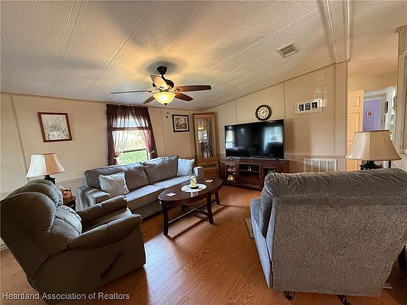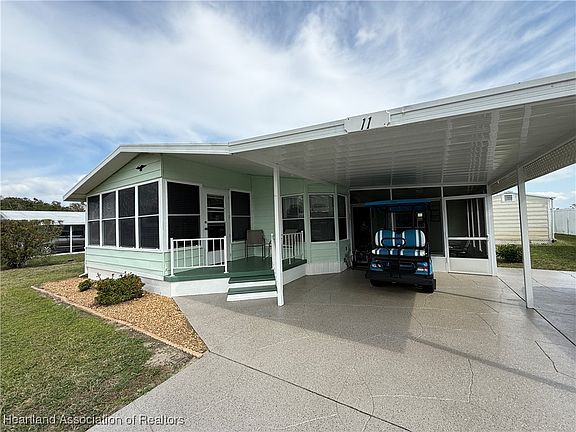This beautifully updated charming, move-in-ready mobile home that is located on your own land (No Lot Rent). This mobile comes fully furnished offering a hassle-free living experience nestled in the serene Knolls Subdivision. The bright and cozy living space is designed with comfort in mind, featuring modern furniture and tasteful decor throughout.The property boasts a decorative concrete driveway, offering both curb appeal and durability. Step into this inviting front porch sunroom, where natural light pours in through large windows, offering a bright and airy atmosphere. Perfect for relaxing or enjoying your morning coffee. Inside, you'll find a mix of carpet, and laminate flooring, providing a comfortable and stylish atmosphere. The home features an updated kitchen with updated appliances, and the bathroom has been remodeled with a new shower and fixtures for a fresh feel. The well irrigation system keeps the outdoor spaces lush and beautiful. There is a generously sized shed, perfect for storing tools, gardening equipment, or creating your own workshop. Bonus with this sale includes a riding Lawn Mower and a golfcart! Whether you're a part-time winter guest or seeking a permanent home in Florida, this property provides everything you need for comfortable living.