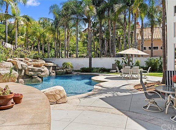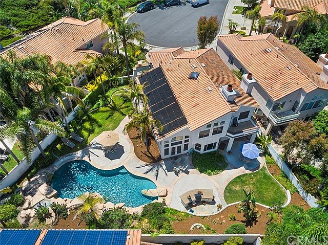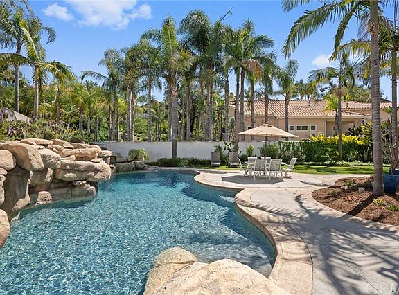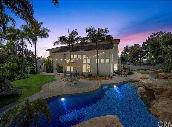 DREAM LOT AND RESORT STYLE BACKYARD! PERFECTLY SITUATED ON A PRIVATE 10,400 SQ FT LOT, PIE SHAPED, END OF CUL-DE-SAC, WRAP AROUND YARD, PEBBLETEC POOL AND SPA, BEACH ENRTY AND WATERFALLS...THIS HOME HAS IT ALL! Featuring 5 bedrooms, including a main floor bedroom with ensuite bath and private access to backyard, lots of windows, natural light and a desirable indoor-outdoor living atmosphere. Showcase kitchen featuring upgraded cabinets, new stainless steel appliances including oven, stove, warming drawer, microwave and dishwasher, new faucet, center island, recessed lights and dining area. Open to family room with raised baseboards and crown moulding, fireplace, upgraded cabinets and media center built ins. Dining room with French doors leading to a resort style backyard. Large master bedroom with private balcony, fireplace and bath with Travertine shower, dual sinks, jetted tub and walk in closet. On second floor, 3 additional bedrooms with private bath including dual sinks. Entertainers backyard includes a wrap around grass area, natural Pebbletec style pool and spa, multiple waterfalls, beach entry, solar panels for the pool, built in BBQ and countertop area. Dual HVAC. All plumbing above the slab. 3 car garage with built ins from Katharine Hepburn's home. Located in the coastal Marina Hills community with renovated pool and spa, tennis courts, tot lot, parks, clubhouse, beach walking trails and a low HOA! Near the coast and a short drive to world famous beaches.