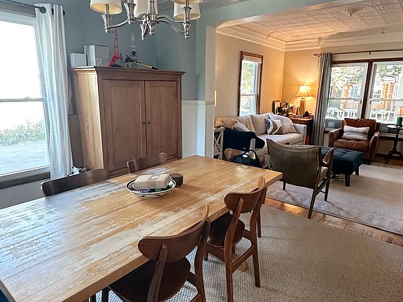 Architectural detailsHalf bathLarge basementOrnate tin ceilingsSpacious front porchDining areaOriginal hard wood flooring