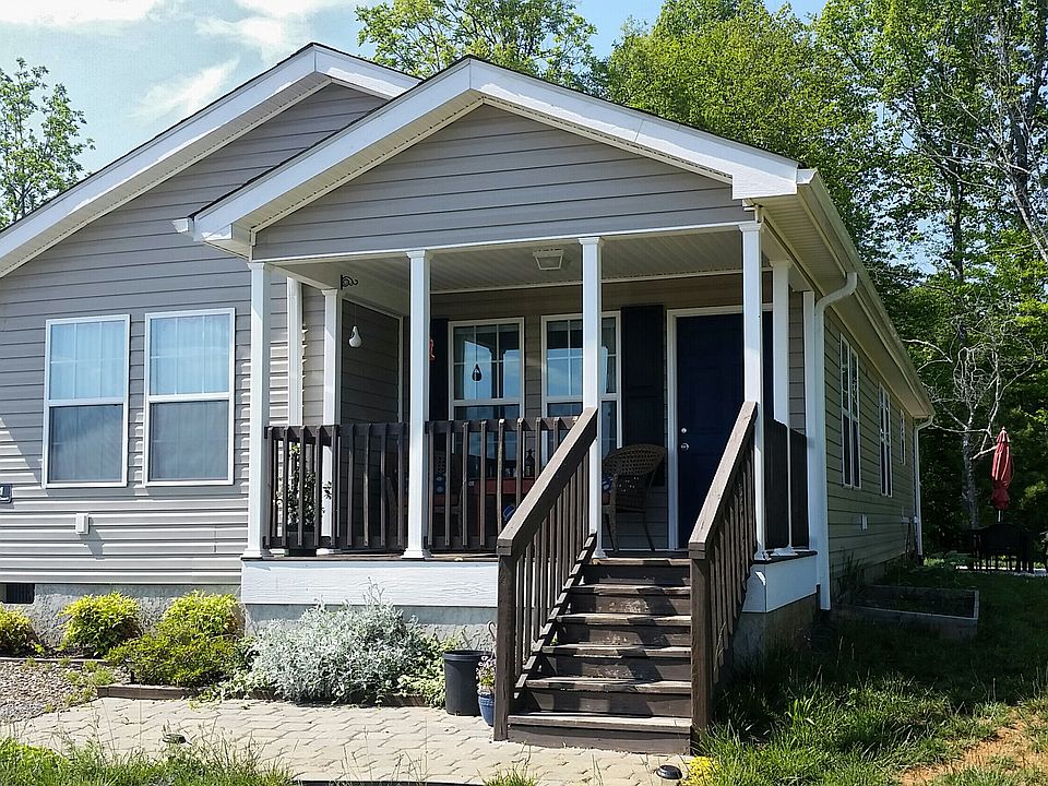 Move-in ready well-maintained 3br/2bath home with open floor plan and long-range mountain views. Great setting - lot is top of the culdesac with covered front porch and space to grow! Big master suite with double basins in bathroom, garden tub and separate shower. Spacious kitchen with eat-in island, ceramic back splash and Kenmore appliances. Laundry room off kitchen flows to private back/side yard - room for garden or shop. Storage shed for yard/hobby conveys. 15-20 minutes to downtown AVL.