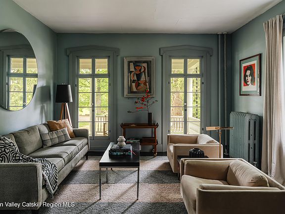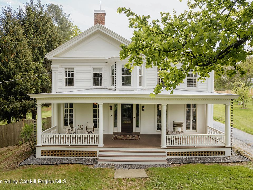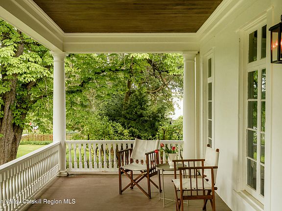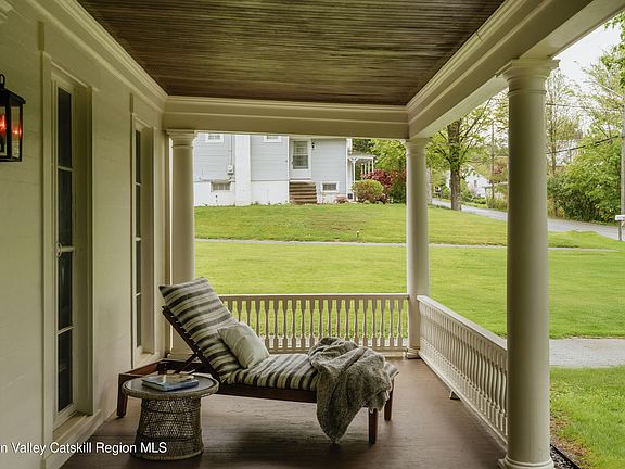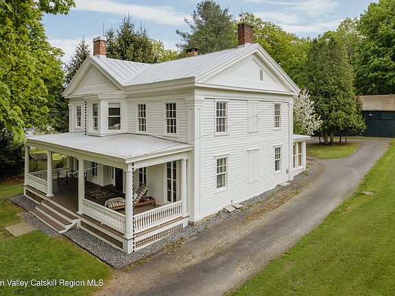 This handsome Greek Revival sits on a quiet street occupying a generous village lot in the historic Hamlet of Hillsdale. Built around 1848, the home feels historic and fresh with plenty of room to spread out. A wide front porch with Doric columns welcomes you inside to a central foyer. To one side, a front parlor opens to a spacious dining room with elegant moldings. The kitchen is a highlight, featuring a 48'' Viking gas range, farmhouse sink, abundant natural light, and a cozy wood stove. A large walk-in pantry keeps everything organized, and just off the kitchen, a four-season sunroom with a gas fireplace looks out over the yard. More gathering spaces include a butler's pantry with wet bar and a built-in booth overlooking a stone patio, a full-length parlor with an electric fireplace, and a cozy reading room has a wood-burning stove. Upstairs, four bedrooms and two full baths are arranged around the landing, while the primary suite includes its own office and an additional full bath. Outside, a large barn provides a spa-styled hot tub room, a workshop and lots of open-space for creative pursuits, and the potential to park up to 3 cars. The large, fenced yard is ideal for pets, gardening, outdoor dining, and entertaining. All of this within walking distance to Hillsdale's grocery store, shops, restaurants, farmers market, and walking and bike trails — plus just 20 minutes to Hudson, 15 minutes to Great Barrington, and minutes from Catamount Resort for year-round recreation. A perfect base for everything upstate has to offer.