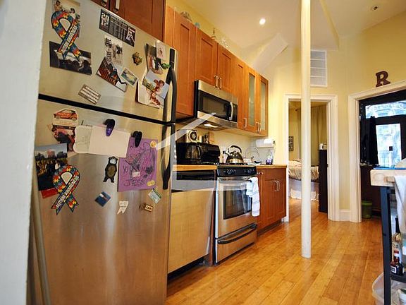 1st floor, floor through layout, bamboo hardwood floors, stainless steel appliances including dishwasher and microwave, butcher block counters, central A/C, laundry in unit, recessed lighting, rear deck off master bedroom, pet friendly and lead paint free.