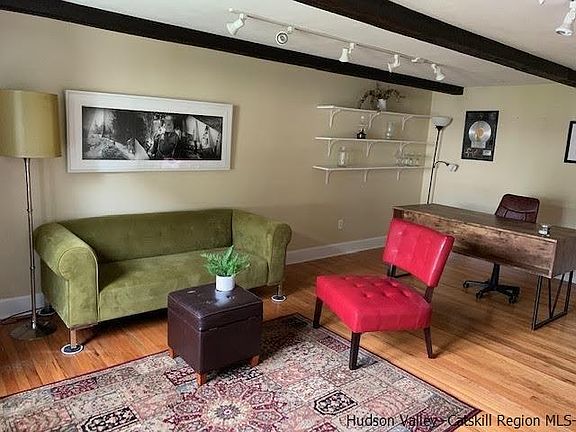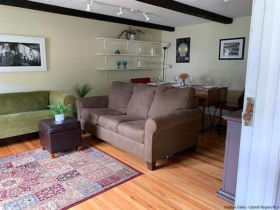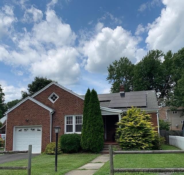 This mid-century brick ranch is located in a peaceful, nature-filled country setting and close to Uptown Kingston's shopping, restaurants and the bus station as well as having fast access to the NY Thruway and is close to Forsyth Park. This home is highly energy efficient with low operating costs due to mechanical upgrades including Geothermal heating/air conditioning and solar energy panels. This private, cozy home is set-back from the street and surrounded by mature plantings and trees. The open plan living/dining room with hardwood floors and beamed ceiling is inviting. Bedrooms have an abundance of natural light streaming through double windows. A large eat-in kitchen with ample cabinets and storage closets leads out to a private 270 sf wood deck. Enjoy entertaining, barbecuing or just relaxing. Walk down from the deck into a lovely, level garden. The backyard includes a convenient attractive shed for additional storage. A full-sized dry basement, with washer and dryer, has ample space for hobbies, craft space or workshop. This house checks all the boxes with it's warm, inviting charm and character. A great starter home or cozy weekender's getaway with a responsible low carbon footprint, close to everything and in one of the most desirable locations in the Hudson Valley. Square footage is based on UCIS property records and the Listing Agent's measurements. Buyer's agents should verify both the Square footage and Taxes which are based on the information provided by the UCIS property records.