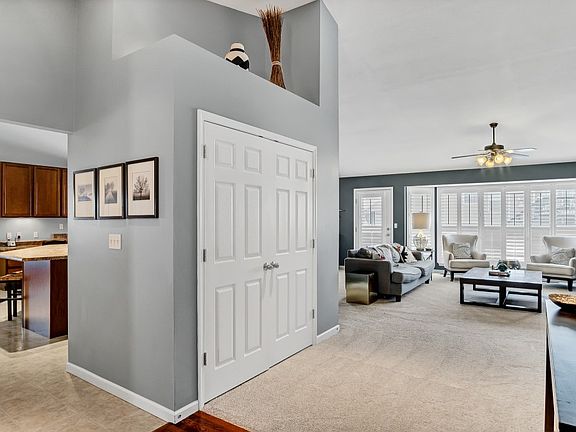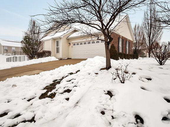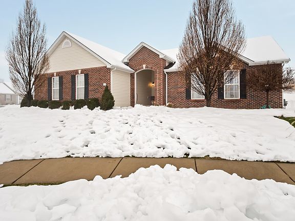 Minutes from I-70 and I-61/64, sits this BEAUTIFUL, 3B/2BA ranch. The professional, mature landscaping adds to the already amazing curb appeal. You'll instantly notice the attention to detail starts with the gorgeous front door. Once inside, the large hardwood foyer sets the tone and naturally draws your eye to the spacious family room accented by beautiful built-ins, plantation shutters, and brand new carpet. Next, this kitchen! It includes 42 inch cabinets, a large center island with seating, and built-in banquette seating around the table. Just off the kitchen is the hearth room. It offers a marble framed, vent-less gas fireplace. On to the master! The vaulted ceiling really opens it up! The master bathroom boosts an over-sized double vanity with makeup table and a large tub with separate shower. Off the bathroom is an incredible, custom walk in closet. Downstairs hosts a partial finish with bonus room, perfect for an office, and plenty of storage in the back with shelving.