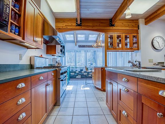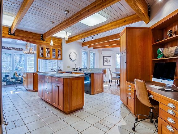SET AT THE FOOT OF PINKHAM NOTCH, THIS STUNNING JACKSON RIVERFRONT CONTEMPORARY offers abundant natural light, a modern post and beam aesthetic, and a spacious feel and floorplan. The main level hosts a well-appointed kitchen with custom cabinetry and plentiful prep space with room for everyone--a bar top, sunny breakfast nook, and open dining area. The living space is framed by the curved balcony above, floor-to-ceiling windows overlooking the Ellis River below, and a floor-to-ceiling granite hearth intertwined with an oak staircase connecting 5,000 square feet of living space over three levels. The main level includes a primary bedroom with bath overlooking the river and an additional guest bedroom and full bath. The sweeping lofted upper level offers room to retreat and relax with a great room, den area, and meditation room. The finished daylight lower level includes a large family room with granite hearth and woodstove, a second guest bedroom with Jacuzzi tub, and direct access to the screened stone patio and hot tub. Amazing outdoor living space with artfully placed granite, mature gardens, and a cedar deck overlooking the river. Fantastic mountain location--Jackson Village, Wildcat Mountain, Pinkham Notch, Great Glen, Jackson Ski Touring, and numerous hiking and ski trails are all within a 10 minute drive. Thoughtfully conceived, this architecturally-designed and engineered home is truly a unique offering.