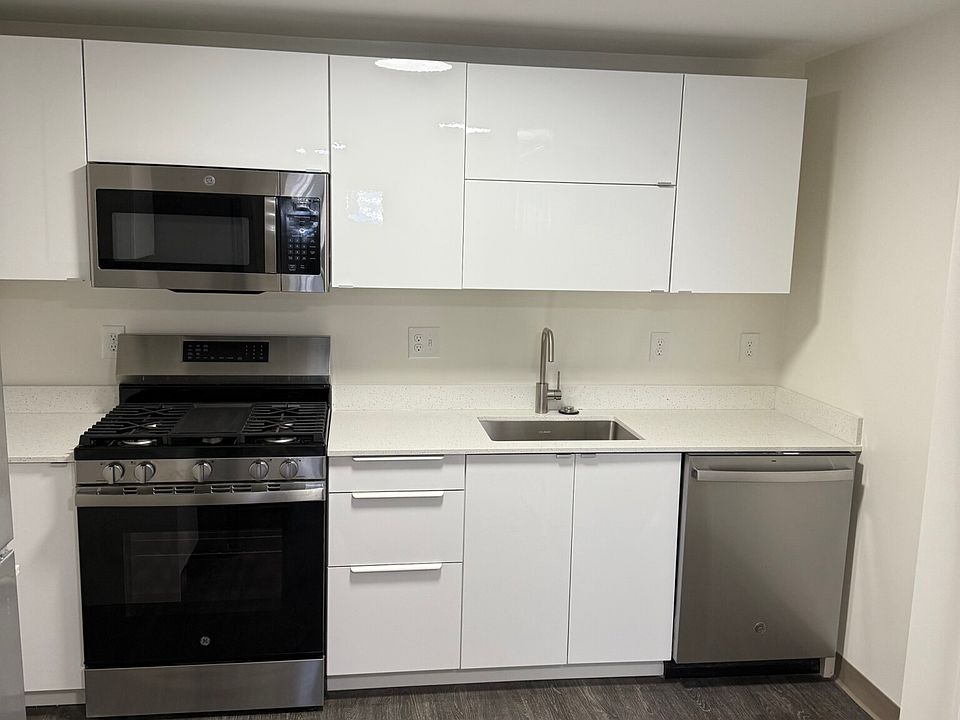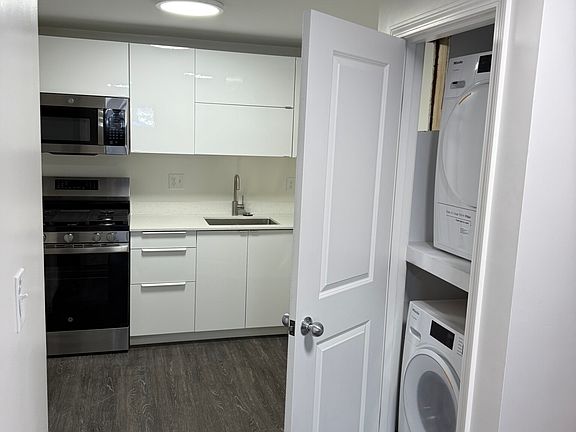 Chic, renovated one-bedroom split apartment located in the heart of Mission Hill. This well-appointed unit features hardwood flooring throughout and a bright, thoughtfully designed layout. The modern eat-in kitchen is fully equipped with high-end finishes, ample cabinetry, and stainless steel appliances, including a dishwasher. The spacious, sun-filled living area provides flexible use of space and opens to a private balcony through a sliding glass door. The unit offers two equally well-proportioned rooms, ideal for use as a bedroom and home office or shared living arrangement. The updated full bathroom is clean and modern. An in-unit stacked washer and dryer adds convenience. Cats are allowed. One on-site parking space may be rented separately. 12 month lease