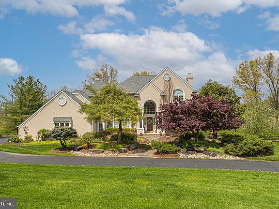 Poised on just over an acre of premier Bucks County land in the sought-out, peaceful neighborhood of Timber Knoll with a private split-railed fenced back yard is this well-maintained home with much to offer.  This pristine, move-in ready, 5-bedroom and 4.2 bath home is minutes from both Bucks County's historic Washington Crossing Park and the scenic Delaware River with its year-round recreation including canal biking and hiking, water-rafting and fishing. Begin your tour of the home’s generous living areas in the open and welcoming foyer anchored by a step-down Formal Living Room and a Formal Dining Room with convenient access to the gourmet kitchen. Both rooms feature tray ceilings offering accent lighting to set the mood for any special occasion and stunning arched entries decorated with columns and crafted moldings. Follow the hardwood floor with marble inlay passed the centrally positioned, winding staircase to the heart of the home’s grand, 2-story Gathering Room filled with such an abundance of warm ambiance and detail your eyes are torn on what to gaze at first. Some eye-catching elements of this room include an architectural Palladium window overlooking the beautifully landscaped rear gardens, stunningly decorated floor-to-ceiling wood-burning fireplace, custom built-ins with display lights, and a convenient overlook from the 2 nd level. The neighboring light-filled Kitchen works well with the entertainment flow and offers an abundance of neutral cabinetry, center island with 5-burner stovetop, granite countertops, modern appliances including a double oven, built-in desk unit, butler’s pantry with wine storage, and a triple window surround breakfast area with picturesque views of the secluded lush backyard and striking free form pool surrounded by nicely landscaped grounds. Around the corner and accessible off of the kitchen you stumble upon a hidden treasure -- a soothing screened 3-Seasons Room! Here you can listen to the calming sounds of the koi waterfall pond while enjoying your favorite read and cup of coffee. Both the kitchen and gathering room offer access to the Trek upper deck along with a staircase to a lower deck for additional entertaining options. Completing this level is a convenient private Study with its custom millwork, half bath, laundry/mud room with second half bath and access to the 3-car side entry garage with ample space for a handyman’s workshop. On the upper level where you will find 4 spacious bedrooms including a double-door entry Main Suite with sun-drenched sitting room, 2-sided gas fireplace, luxurious private bath boasting a jacuzzi corner tub, steam shower and exceptionally roomy walk-in closet. Down the hall is a second bedroom with private bath while bedrooms 3 and 4 share a Jack & Jill bath with double vanities. The finished walkout basement offers added living space with a recreation room adorned with a corner brick fireplace, wet bar, sizable 5th bedroom, full bath and plenty of storage space including a large utility room. Additional amenities include 2nd floor laundry chute, 2 newly installed water heaters, softener/UV light, second washer and dryer hook-up, recessed lighting, 9ft. ceilings, and potting shed. Close proximity to New Hope and Washington Crossing Park. Stop by today to see what makes this lavish “model-like” home so special!