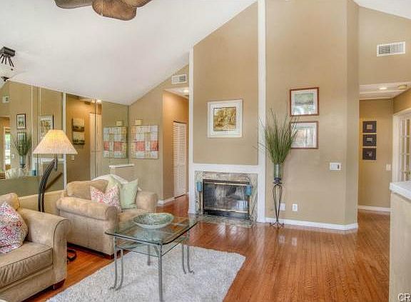 Back on Market! Get your second chance at this amazing place! Location, Location Location! Picture Perfect upper end unit! Come see this amazing home with cathedral ceilings in the bedroom with crown molding and vaulted ceilings in the living room! Enjoy the upgraded granite kitchen with stainless appliances, Dual Pane windows, central AC/Heat, real hardwood flooring, grand fireplace, impressive tiled shower with beautiful glass door. Upgraded mirrors and closet doors, over sized balcony in the living room and a second balcony from the master. Laundry is outside the master bedroom for easy access. Garage is attached with direct access to the unit and has an automatic roll up garage door. Property has a prime upper end unit location near the pool and mailboxes for easy access to summer fun. No Mello-Roos