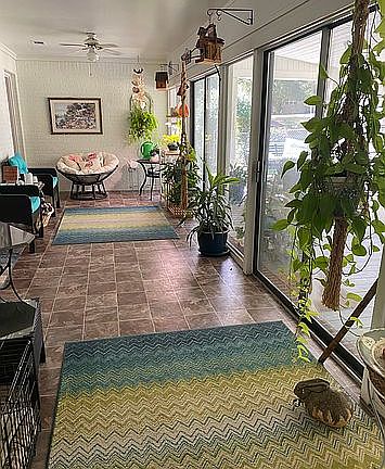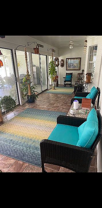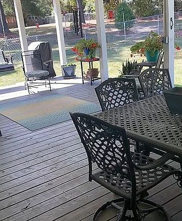 Manicured yardCovered deckFenced in backyardFruit treesFlower bedsLarge front porchGlass in sunroom