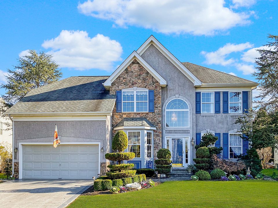 Impeccably maintained and extended Providence Grey Manor model in the desirable Wexford Estates development of Moorestown. This 4 bedroom, 2.5 bathroom home has many additional features and upgrades including hardwood floors extending throughout the first floor, stone tile flooring in the kitchen, a 4ft family room extension, gas fireplace, stone patio, granite worktops in the kitchen and breakfast nook, a stamped concrete driveway and a brand new heating and air conditioning system installed in May 2019. As you enter into the home you are greeted by a double height foyer with beautiful wooden staircase and chandelier. The generous study, which could be used as an office, playroom or additional guest room is to the left, and the main living room to the right. Through the living room you enter into the dining room with gorgeous wainscoting details. As you enter into the kitchen, the home opens up to show a breakfast nook and large family room with cathedral ceiling and feature fireplace. The first floor also has a tasteful powder room, laundry room, access to the two car garage and the basement. There are sliding glass doors in the nook that open into the lovingly landscaped backyard, perfect for entertaining. Through the family room there is a second staircase leading you upstairs to 3 generously sized bedrooms, a family bathroom with double vanity and a large master ensuite. The master has a large walk-in closet and a remodeled bathroom featuring a double vanity, walk-in shower and stone tile details. The basement is packed full of potential - clean, tidy, dry and easily finished to create additional living space if required. Only a hop, skip and a jump away from all the wonderful amenities that downtown Moorestown has to offer, and other great services such as Wegmans and the local dog park are close by, and a mere 5 minutes drive to Moorestown Upper Elementary School.