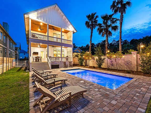 Experience waterfront luxury living at its finest with this breathtaking Inlet Beach retreat nestled along the serene shores of Lake Powell mere moments from the beach and excellent dining, shopping, and activities. Boasting a 4-bedroom, 4.5-bathroom primary residence along with a separate 1-bedroom, 1-bathroom carriage home, private saltwater swimming pool, and private dock, this property is a haven for those who cherish a waterfront lifestyle. Step into a coastal oasis where every detail exudes tranquility and elegance. The main home welcomes you with warm toned hardwood floors, natural brick accent walls, and transom windows that bathe the interiors in natural light. Entertain effortlessly in the chef-inspired kitchen, featuring a magnificent waterfall marble island, high-end stainless-steel appliances, and custom white cabinetry. A porch overlooks the private saltwater swimming pool, complete with a sun shelf and paver patio, offering the perfect spot for relaxation and enjoyment. A generously sized guest bedroom with an ensuite bath and a stylish powder room also located on the first level.