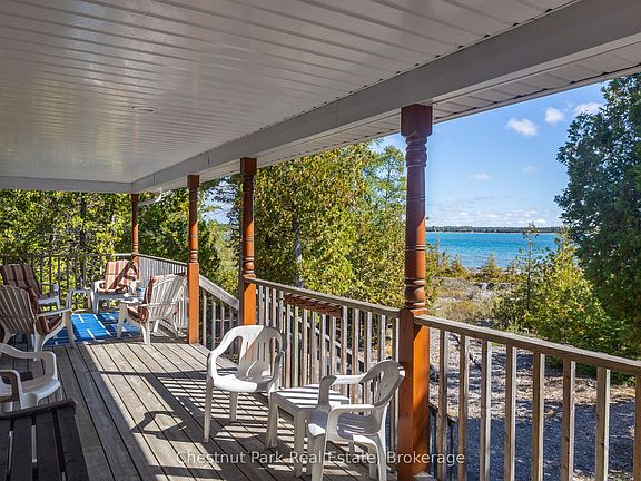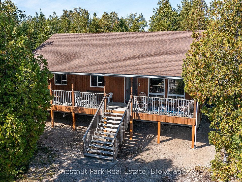 Private Waterfront Retreat Near Tobermory. Discover this rare and very private home or cottage set on an extra-wide waterfront lot with sunny southern exposure. Meticulously maintained by the original owner, this property is a true turnkey retreat being offered with most contents included. The open-concept layout is filled with natural light and showcases stunning lake views throughout the common areas. A spacious kitchen with modern appliances and generous counterspace flows seamlessly into the living and dining areas. Three comfortable bedrooms and a large 4-piece bathroom with laundry provide main-floor living convenience. Warm pine and cedar accents enhance the inviting character of the home. Step outside to a large 335 square foot covered waterside deck, perfect for relaxing with a book, napping in a hammock, or entertaining while enjoying sparkling lake vistas. Below, a dry crawl space offers excellent storage for water toys and bikes. Ample parking is available, with room to build a detached garage if desired. The lot offers multiple serene spots for quiet enjoyment, birdwatching, or simply soaking up the sun. Easy access to the water with gradual entry for ideal swimming or launching of kayaks. Located near Singing Sands Beach and just a 15-minute drive to Tobermory, this property offers both seclusion and easy access to local amenities. A rare opportunity to own a modern, move-in ready waterfront retreat in one of the Bruce Peninsulas most sought-after areas.