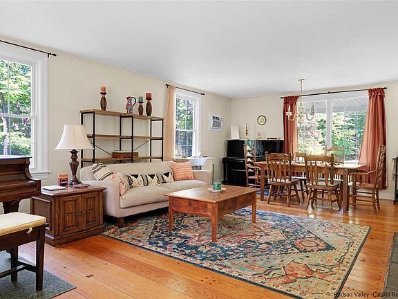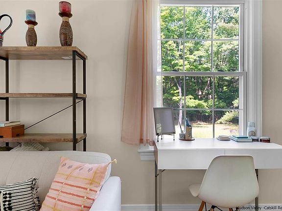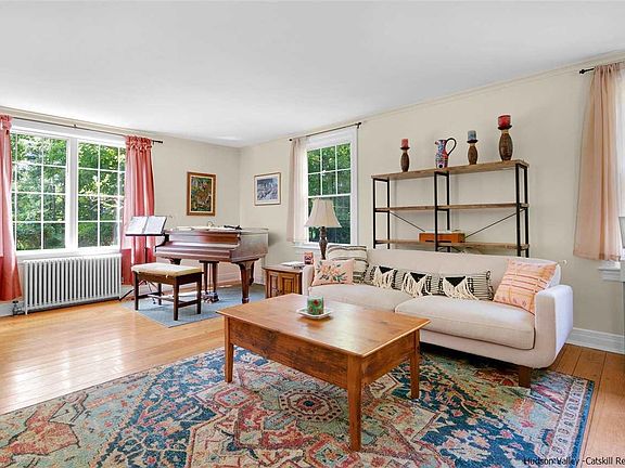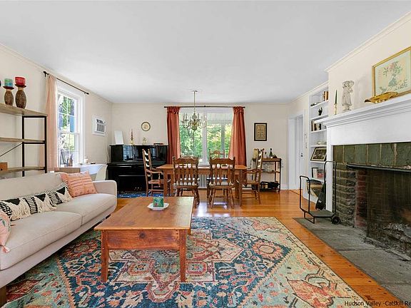 ***OPEN HOUSE SATURDAY 10/15 2-4 PM*** 3 BR/ 2.5 BA HOME WITH LARGE STUDIO APARTMENT Historic Woodstock home on a quiet street, a convenient short walk to the village, stores, restaurants, Woodstock Elementary School and New York City bus. Built in 1938 by theatrical visionary Robert Elwyn when he was building the Woodstock Playhouse next door, and designed by famed local artisan Art Wolven, it has many artistic features as well as modern upgrades. The property features sprawling lawns on all sides, mature and ornamental trees, bluestone walkways, a 400 sf mahogany porch, and an 8'X10' shed for tools or storage. The ground floor of the main house features a large living room with a Rumford fireplace, built-in bookshelves and wide-plank flooring. The kitchen and downstairs bath are newly renovated. The kitchen features maple cabinets, quartz counter tops and new, energy efficient appliances. A wood-paneled den on the ground floor can serve as a home office or a bedroom. Outside the den is a dutch door and a maple staircase. The upstairs features two large bedrooms with newly sanded oak floors and a full bathroom with ceramic flooring. There is also a second-floor attic for storage or a children's play space. A breezeway leads through the laundry room and a work room to a two-car garage with a 450 sf. studio apartment above. The apartment has an open-space plan, a renovated kitchen and bathroom, two closets and storage space. It can serve as a guest quarters or be rented out. The house was bought in 2008 from the Elwyn family by the current owner, who has installed new oil tanks and a new boiler, driveway and roof. Energy efficient features include water-conserving toilets, double-glazed windows and attic insulation. Enjoy this historic, well-built, lovingly maintained house in its unique location that offers both seclusion and convenience.