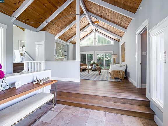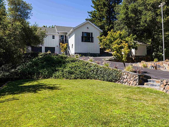 Modern farmhouse with backyard tropical paradise, fresh interior finishes, and an additional detached approx. 700-square-foot Dome/flex space with HVAC, electrical, and a bathroom nearby, offers endless possibilities. The two-level home features approx. 2,769 sf of living space on a deep .65-acre lot with expansive front gardens and lawns and a gated entry. Towering palms and oaks and a lush, refreshed landscape, lawn, and terraced garden create an inviting backyard sanctuary complete with a dramatic waterfall spilling into a sparkling pool and adjacent infinity-edged hot tub. Gather around the pool patio or on the deck and relish the peacefulness and the inspiring views. Fresh interior and exterior paint, refinished hardwood floors, vaulted exposed beam and tongue and groove ceilings, large windows, crown molding, and abundant natural light create a bright, light-filled interior. The expansive formal living room enjoys views of the redwoods and the garden. Step up to the formal dining room with built-in cabinetry and a high ceiling that adds volume to this already sizeable room. Kitchen overlooks the family room and hillside garden, offering s,s. appliances. New paint & newly stain hardwood floors throughout most of the home.