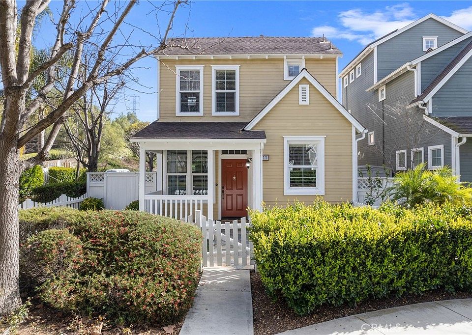 Located in one of Orange County's finest communities awaits this charming, cape cod inspired home. Tree lined streets and manicured greenbelts induce euphoria as you are welcomed by a white picket fence, wrap around yard and quaint front porch. This 3 bed, 2 1/2 bath home features an open concept floor plan with an abundance of natural light. The downstairs is comprised of a living room centered around a cozy fireplace, dining room and kitchen. Recently remodeled, the kitchen includes white quartz countertops, tile backsplash and newly installed appliances. The second level hosts all three bedrooms, laundry area, and a jack and jill bathroom. The large master suite includes a walk-in closet and a newly renovated bathroom with dual vanity sinks and an oversized walk in shower with a dual shower system and rain shower feature. As you embrace the ultimate Ladera lifestyle you will enjoy copious amenities such as four clubhouses, a multitude of pools and parks, hiking and walking trails, the water park, sport courts, dog park, skate park and several annual events and festivities including summer concerts in the park, Ladera's very own firework display and monthly farmers market. Ladera Ranch is also host to highly ranked schools comprised of 3 Elementary schools, 1 Middle school and many Preschools and Daycares. There is a reason why this community is loved by many and why you should not miss this opportunity.