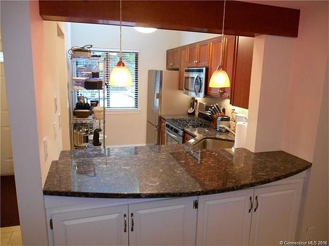 Spotless unit in great location at Meadow Farms. Open and updated with wood floors and beautiful sunny remodeled kitchen with cherry cabinets, granite counters, stainless applainces, breakfast bar, under cabinet lighting, 5-burner gas range and skylight. New roof and newer Trane gas furnace and central air. 2.5 baths, spacious master bedroom with full bath and large walk-in closet, full basement, attached garage and plenty of guest parking nearby. Deck has pretty wooded views. Just move in and enjoy Meadow Farms! FHA approved complex. Immediate occupancy.