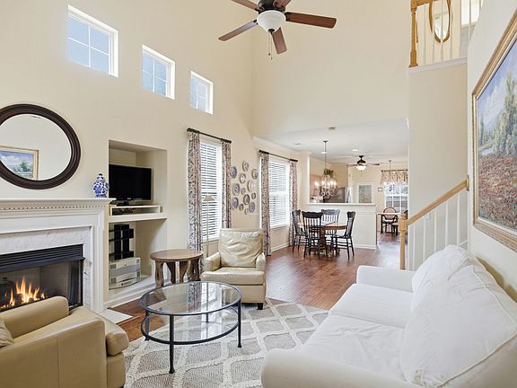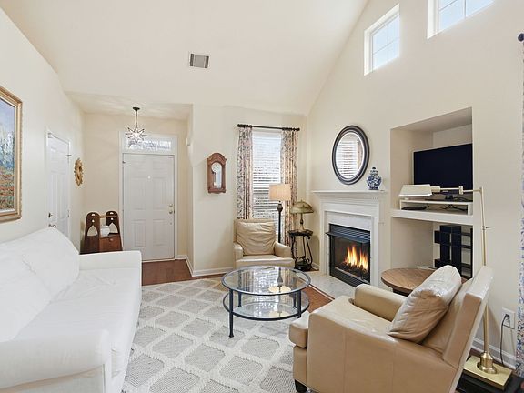 The main level features a welcoming living room with soaring ceilings, a cozy gas fireplace, and built-ins. Just beyond, a light-filled formal dining area provides the perfect space for hosting or everyday meals. The spacious eat-in kitchen offers a pantry and a full-light door that opens to the private deck. Step outside and enjoy direct access to a wide-open common green space—ideal for morning coffee, pets, or simply unwinding outdoors. A convenient half bath and a one-car garage with extra storage complete the main floor.