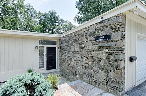 Welcome to this distinctive California style contemporary home located on a dead end street~~~From every angle walls of glass focus on this private wooded lot~~~Stunning departure from the ordinary in this reverse floor plan nestled on the side of a hill~~~The dramatic entrance into the foyer opens to the living - dining room with an off the floor stone fireplace and beamed ceilings~~~Step saving kitchen with granite counter tops, tile backsplash, gas cooking and ceramic tile floor~~~The primary bedroom with a private bath and walk in closet is ideal if you need one level living~~~The lower level features an open family room with a brick fireplace and sliders to the rear patio and in ground pool~~~Two more bedrooms, full bath, laundry room and a storage room finish out this level~~~Many updates, fresh paint, this home is ready for your own finishing touches~~~Easy access to local colleges, medical facilities, train station and the new Woo Sox Stadium~~~