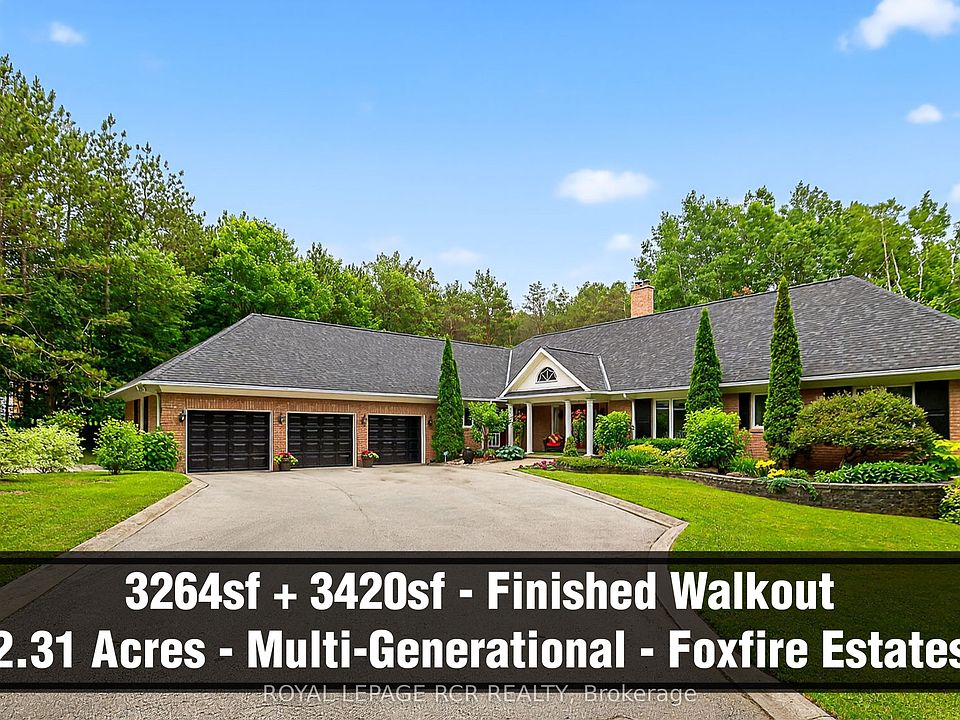 Rare Multi-Generational 3264sf + 3420sf Bungalow with walk-out lower level in the prestigious Foxfire enclave located within minutes to Downtown Uxbridge. Fabulously nestled on a private 2.31-acre lot with mature trees and southwest exposure, this bright and cheerful bungalow presents 9ft ceilings, 6 bedrooms, 6 bathrooms, and a 3-car garage. Stunning curb appeal with the covered front porch, 3 car garage, new roof (2020) and professional landscaping. The expansive lot, framed by towering trees, offers 360-degree forest views, private trail, an area to practice your golf swing and exceptional privacy. The two-tiered backyard oasis includes a private deck off the main floor kitchen and a spacious patio off the lower-level walk-out. Step through the covered porch into an open-concept foyer leading to an oversized living room with a double-sided fireplace and gleaming hardwood floors. The primary suite is a retreat, featuring his-and-her walk-in closets, a 6pc ensuite, and a private balcony with breathtaking forest views. Two additional bedrooms, each with ensuite bathrooms and walk-in closets, ensure comfort for all. The gourmet kitchen, with a large breakfast area, flows into the formal dining room and opens to the deck. A cozy family room with a fireplace, wet bar, and hardwood floors offers a perfect relaxation space. Main floor laundry and a side entrance connect to the 3-car garage, with the first bay featuring a 240-watt heater for year-round comfort. The finished lower level features a full kitchen, breakfast area, living room with a wood fireplace, walk-out to the patio, three spacious bedrooms, two bathrooms, and an exercise room. An exterior detached garage/shed is ideal for storing a lawn tractor.A Prime Location, Foxfire Estates, offers access to scenic trails, rolling hills, and mature forests, all just minutes from Uxbridge, Elgin Park, and big-box shopping. Easy access to 407 via Lakeridge Road, this property combines rural tranquility with convenience.