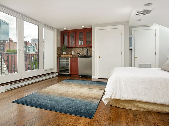 Exquisitely renovated 2-bed PH located in the heart of Back Bay! This sun-drenched condo offers glorious city views from every room- + a private deck and ROOF RIGHTS-and comes complete with soaring ceilings, custom lighting, central AC and hardwood floors throughout. Phenomenal chef's kitchen boasts stainless steel appliances, custom-built cabinetry and Carrara marble countertops w/ a breakfast bar that opens up into the living area for easy entertaining. Dramatic open living/dining area features large windows, an elegant fireplace and a storage piece w/ a Murphy bed. Large master bedroom offers fantastic custom built-ins and a walk-in cedar closet. Luxurious bath with herringbone marble floors and plenty of extra storage space. Second bedroom is a versatile lofted space w/ built-in desk and also features an impeccable wet bar/beverage center perfect for entertaining off the deck. Common areas renovated in 2018. Professionally managed, 4-unit association. The epitome of chic city living, A gem!