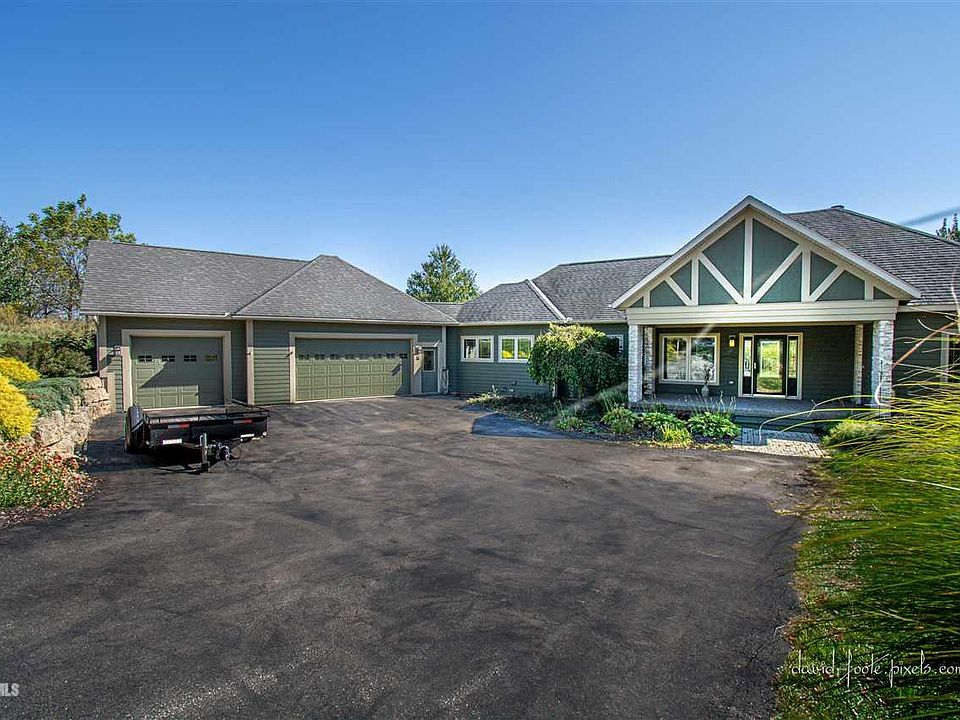 A rare find! Stunning contemporary sited on 1.48 acre wooded lot perched above hole #2 of Eagle Ridge's "The General" Golf Course offering breathtaking vistas, wooded backdrop, manicured surrounds, 3 car garage with stairs to huge storage space above, and main level living at its finest. Entry opens to dramatic great room with floor to ceiling stone surround fireplace, built-in entertainment cabinet, wood floors and wall of windows that pulls the outside in. Dining area just beyond feeds to kitchen with stainless appliances, eat-at counter, cherry cabinetry, solid surface counters, and tile backsplash, and is convenient to converted sun room with tile floors, unique pass through to high top bar counter, wood clad ceilings and walls, corrugated metal wall accent wall and direct access to expansive rear deck with room to entertain and enjoy the views. Spacious main level master bedroom has tray ceiling with accent lighting, and adjoins recently updated private full bath that offers the utmost in luxury with granite topped double vanity, generous whirlpool tub, beautiful tile flooring, and stunning floor-to-ceiling tiled walk-in steam shower with multiple sprays and seating space. Main floor also houses powder room, and laundry room with cabinetry, sink and folding counter. Walk-out lower level houses huge family room with gas "woodstove", built-in wet bar with mini fridge plus ample room for relaxation or recreation, guest suite with private bath, an additional comfortable guest bedroom, a nicely appointed full bathroom, and bonus hobby room/den/office. Attached heated three car garage with storage closet has ample room for vehicles, lawn equipment, and/or workshop, and also offers expansive unfinished storage area above with stairway access. Outdoor space is highlighted by meticulous landscaping, use of limestone accents, rear paver patio with walkway to leads to circular paver sitting area ideal for a firepit, rear deck, large front covered front porch, and trails to meander about the property, enjoy nature, and views of the golf course beyond. Low maintenance cement board exterior siding. Home was well planned, and offers lots of storage throughout.