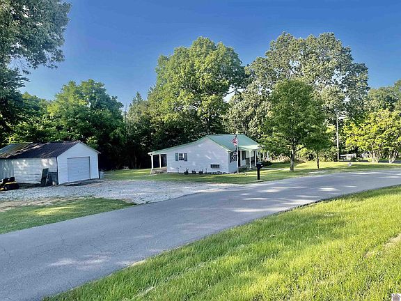 Country living is at its best with this home. Setting on a corner lot and Approx 2 acres. Minutes to Golf course and Lake Barkley Lodge Marina with Dining and Boat ramp. Cozy and adorable. Ready for you! 3 bedrooms and 1 bath. Detached garage. Covered Front and back porch. The Bench on the front porch is included with this property. Don't miss this one!!