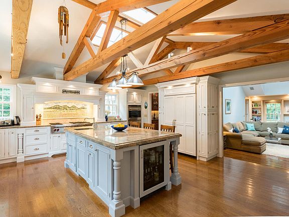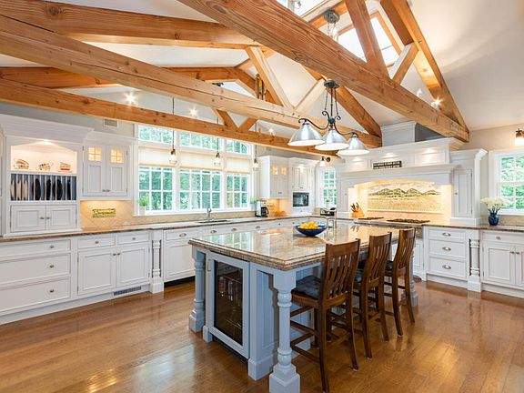 Holidays will be a dream at this built for entertaining 5 bedroom, 3 full and 2 half-bathroom move-in ready home on a flat acre close to the beach. A French-style kitchen with an oversized granite island, high-end appliances, open to the family room with its imposing fireplace. An eat-in breakfast room with sliding doors leads to a large stone patio with hot tub and generous seating/dining space. A butlers pantry connects to the dining room and formal living room. The master bedroom has two walk-in closets and ensuite bathroom, with two further bedrooms and a bathroom on the second floor. The third floor, completed in 2012 has two bedrooms and a bathroom with 9ft+ ceilings. A fully-finished basement with an exercise room, laundry room, and playroom complete this wonderful home.