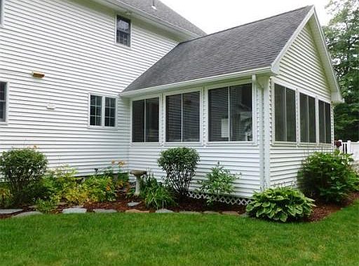 Beautifully maintained Colonial. Private setting on cul-de-sac in desirable neighborhood, this home abuts conservation on rear and right of home. Great open floor plan with two story foyer, large kitchen with painted maple cabinets, quartz countertops, stainless appliances, island with breakfast bar and hardwood floors. Spacious eating area has sliders to 4 season sunroom with cathedral ceiling/fan, gas stove, ceramic floor, tongue and groove paneled walls and ceiling, and door to deck overlooking private yard with inground pool. Living room with hardwood floor and French doors that open into family room with cathedral ceiling/fan, gas fireplace, built-in bench seating and shiplap fireplace wall, recessed lighting. Formal dining room has hardwood floor, chair rail, crown molding. First floor half bath and laundry with shower. Master bedroom on second floor with private bath and walk-in closet. Three additional bedrooms plus full bath complete the second floor.